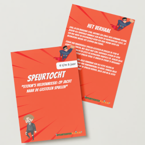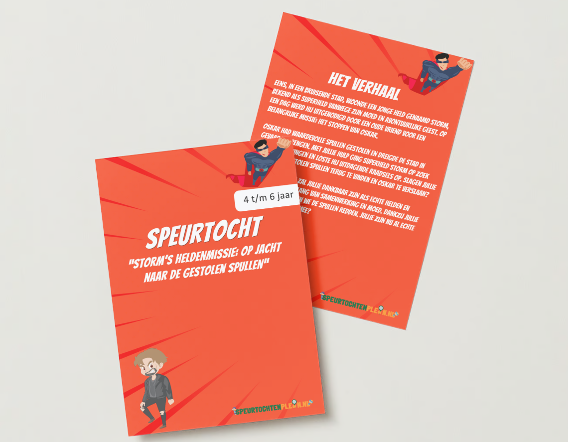 De Superhelden-speurtocht bevat alles wat u nodig hebt voor een geweldige activiteit. Of u nu een kinderfeestje organiseert, een familiedag plant of gewoon iets leuks wilt doen tijdens de vakantie – onze Superhelden-speurtocht biedt een spannende en unieke ervaring die direct per e-mail of per post geleverd kan worden. Geen gedoe, minimale voorbereiding en een complete ervaring vol superkrachten. Laat iedereen genieten van een avontuur dat net zo gedenkwaardig is als Storms strijd tegen Oskar!
